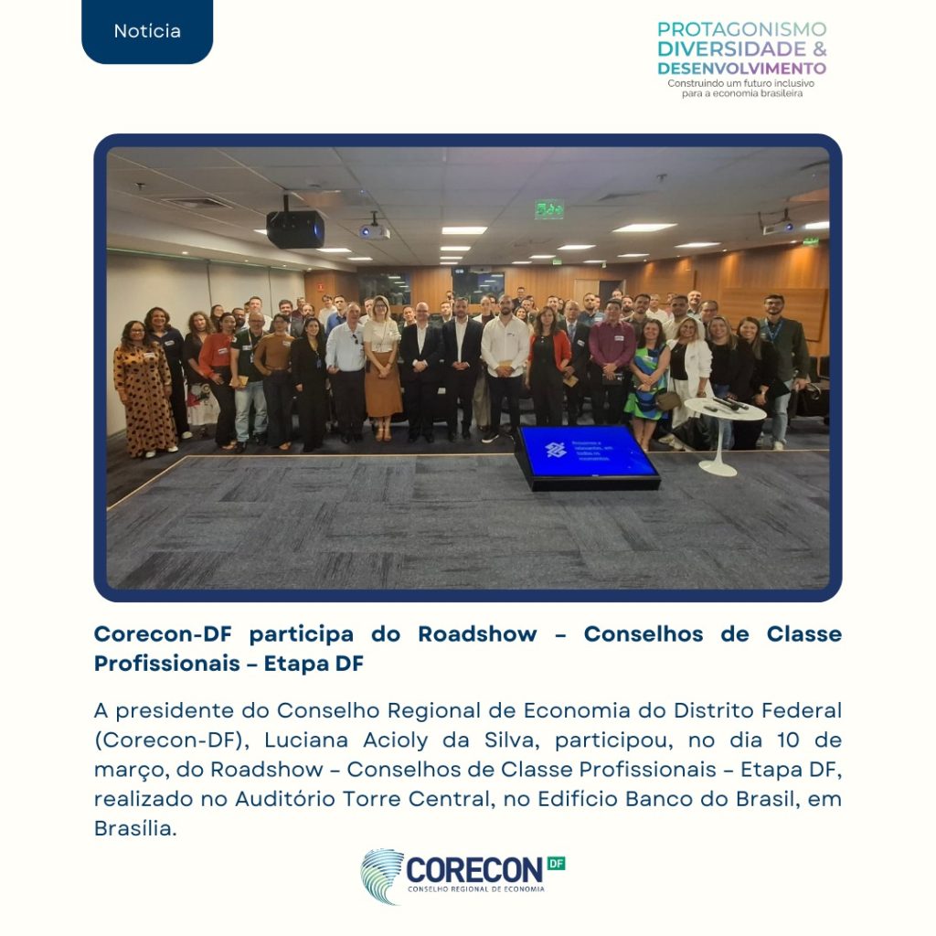 A presidente do Conselho Regional de Economia do Distrito Federal (Corecon-DF), Luciana Acioly da Silva, participou, no dia 10 de março, do Roadshow – Conselhos de Classe Profissionais – Etapa DF, realizado no Auditório Torre Central, no Edifício Banco do Brasil, em Brasília. O encontro reuniu representantes de diversos conselhos profissionais do Distrito Federal com…