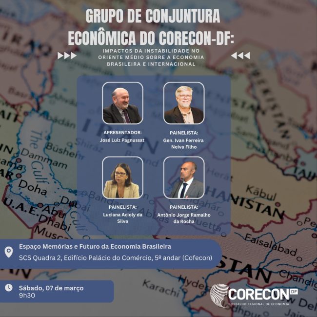 O Conselho Regional de Economia do Distrito Federal (CORECON-DF) convida economistas, estudantes, pesquisadores e profissionais interessados para mais uma edição da Reunião do Grupo de Conjuntura, que será realizada no próximo dia 07 de março (sábado), às 9h30, com o tema: “Instabilidade no Oriente Médio e seus Efeitos na Economia Internacional e Brasileira”. O encontro…