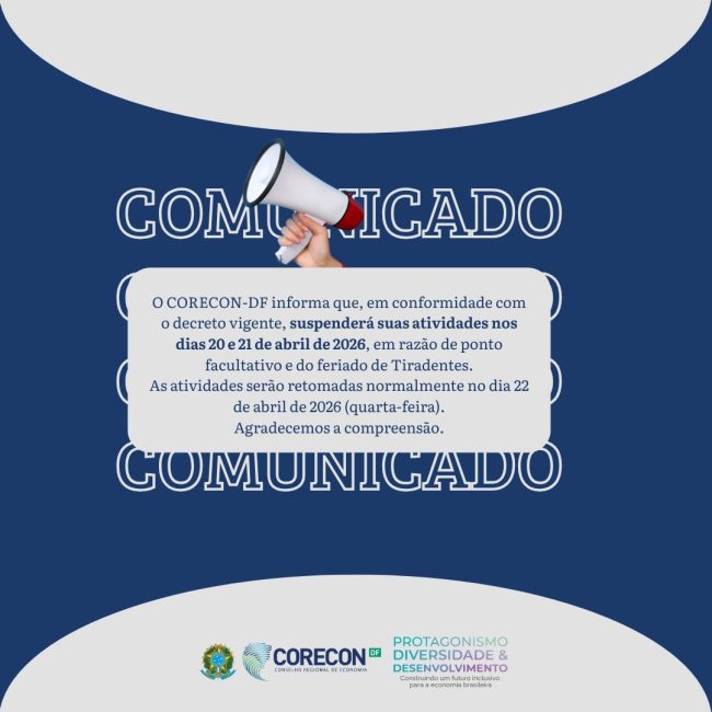 O Conselho Regional de Economia do Distrito Federal (CORECON-DF) informa que, em conformidade com o decreto vigente, suspenderá suas atividades nos dias 20 e 21 de abril de 2026, em razão do ponto facultativo e do feriado de Tiradentes. Durante esse período, não haverá atendimento ao público nem expediente administrativo. As atividades serão retomadas normalmente…