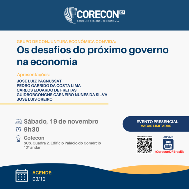 O Corecon-DF retomou seu tradicional prêmio de monografias, este ano em duas categorias: 1) Ciências Econômicas; e, 2) Comércio Exterior, Finanças e Relações Internacionais. Serão premiadas as três melhores monografias de cada categoria. As inscrições poderão ser feitas do dia 1º de novembro a 30 de dezembro de 2022 e deverão ser encaminhadas pelos Departamentos…