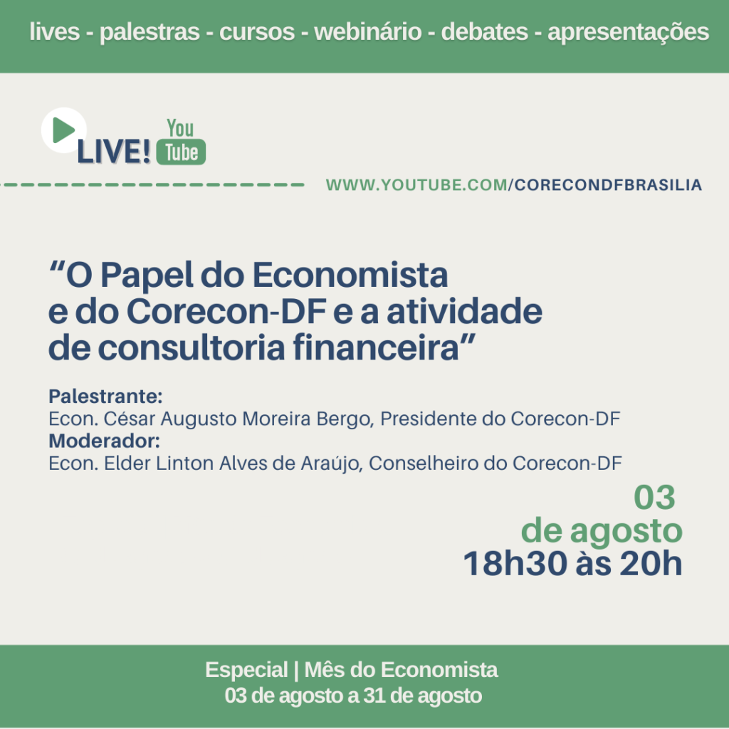 Em celebração ao Dia do Economista, comemorado anualmente no dia 13 de agosto, o Conselho Regional de Economia do Distrito Federal (Corecon-DF), promoverá diversas atividades durante todo o mês de agosto. Neste sentido, gostaríamos de convida-los a participar da nossa programação. Durante o mês, serão realizados diversos eventos, conforme a seguir: No dia 1º de…